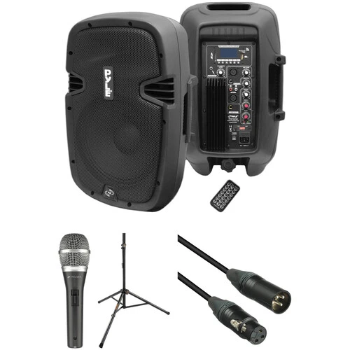 Kit includes a Pyle Pro PPHP1037UB powered speaker with a wireless remote control, a handheld dynamic microphone, a tripod speaker stand, and one balanced XLR 3-pin microphone cable—everything you need to pipe your music and voice out to a crowd. The PPHP1037UB 10″ 700-Watt Powered 2-Way Speaker from Pyle Pro The speaker has an integrated 3-channel mixer, allowing you to